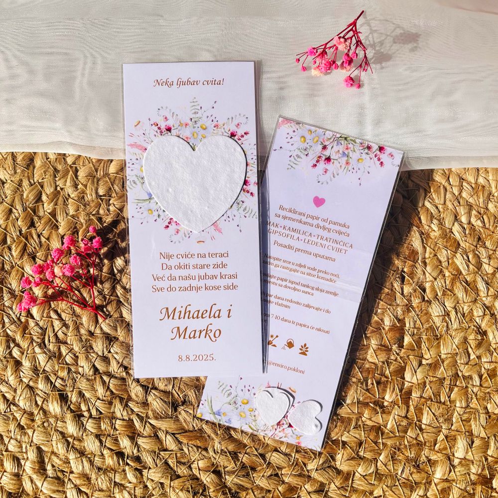 Oblik srce: sadni papir od recikliranog pamuka sa sjemenkama divljeg cvijeća: mak, kamilica, tratinčica,