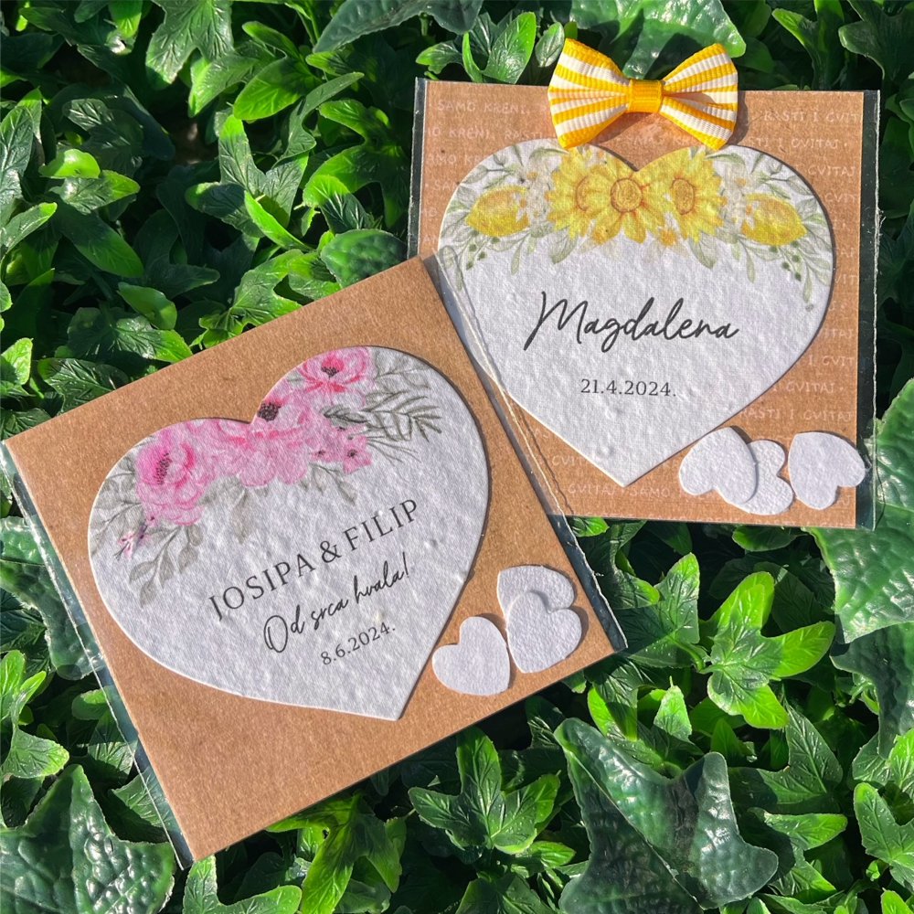 Oblik srce: sadni papir od recikliranog pamuka sa sjemenkama divljeg cvijeća: mak, kamilica, tratinčica,